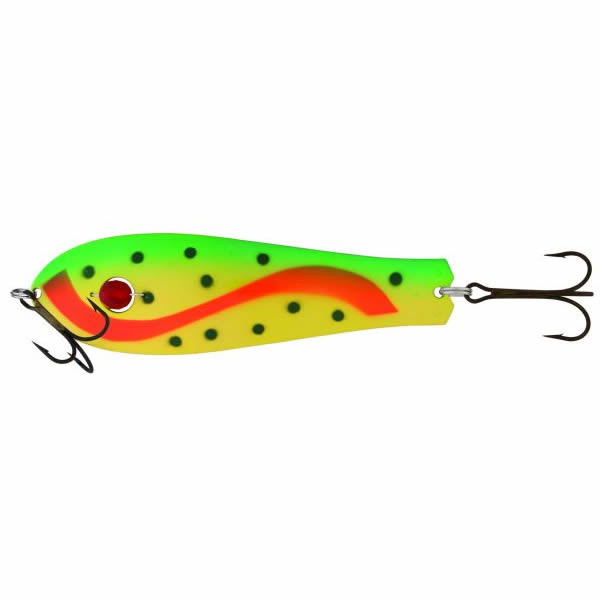 Блесна Kuusamo Professor 1, 115/27 с камнем BL/FR/GR/FYe-C активно применяется при троллинге, когда поклевки наиболее часто происходят в верхних слоях водоема. Яркие цвета можно применять при ловле на глубине с помощью даунриггера или других утяжелителей. Данную модель можно привязывать к любой из сторон, изменяя характер игры. Второй тройник рекомендуем отстегивать, избегая тем самым частых перехлестов с леской. Большинство рыболовов ловят на Professor 1 115/27 с тройником, расположенным в утолщенной части блесны. На эту блесну одинаково успешно реагируют такие виды рыб, как щука, судак, морская форель и лосось. Применение: троллинг, кастинг.