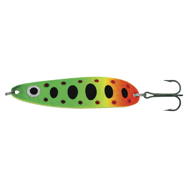 Блесна Stinger Phantom 60/15 #FTG имеет узкую вытянутую форму и достаточно толстую стенку, благодаря чему справляется с самой сильной струей и далеко и точно забрасывается. Незамедлительно атакует любого малька, попавшего в зону видимости. Поэтому овальный контрастный узор служит дополнительным раздражающим фактором блесны. Также эта блесна идеально подходит для ловли морской кумжи взаброс и троллингом. Разрабатывалась специально для ловли лосося на течении.