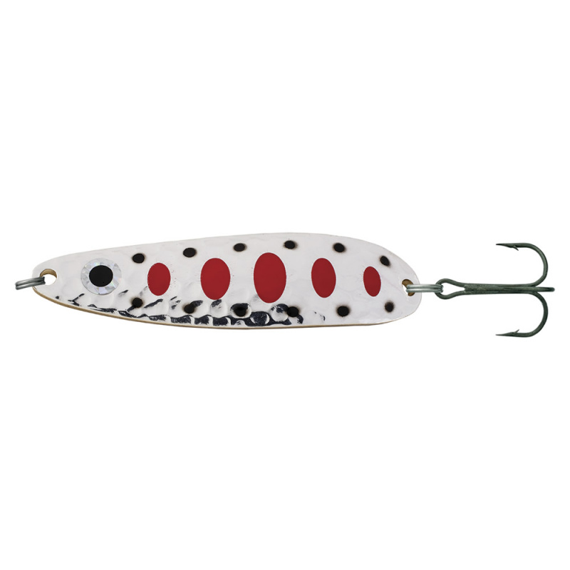 Блесна Stinger Phantom 70/22 #SRG имеет узкую вытянутую форму и достаточно толстую стенку, благодаря чему справляется с самой сильной струей и далеко и точно забрасывается. Незамедлительно атакует любого малька, попавшего в зону видимости. Поэтому овальный контрастный узор служит дополнительным раздражающим фактором блесны. Также эта блесна идеально подходит для ловли морской кумжи взаброс и троллингом. Разрабатывалась специально для ловли лосося на течении.