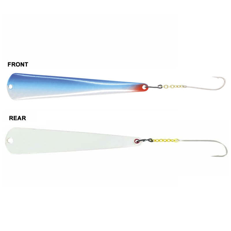 Блесна зимняя Kuusamo Simfonia 40/6 R/BLU/S-S, UV - приманка, имеющая толстую и узкую пластину, которая расширяется и уплощается кверху. Такая геометрия способствует хаотичной игре: приманка то неожиданно уходит в сторону, то начинает дрожать. Серия блесен зимняя, рассчитана на вертикальные проводки. Создатели рекомендую чередовать подбросы, встряхивания и другие приемы анимации с паузами. С такой приманкой можно охотиться на зубастую щуку, судака, окуня.