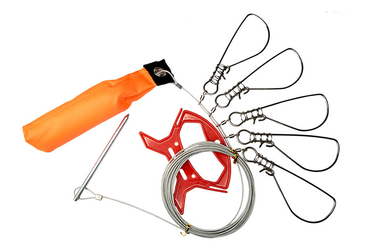 Кукан рыболовный предназначен для сохранения живой пойманной рыбы. Кукан оснащен пятью застежками с D-образными замками, повышающими надежность фиксации, мотовилом для основного шнура и поплавком. Поплавок яркого сигнального цвета хорошо заметен на воде. Мотовило имеет замок-прорезь для фиксации шнура.
