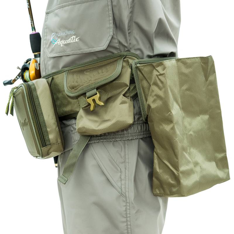Разгрузочный пояс разработан для рыболовного туризма. Передний карман комплектуется коробками fisherbox 22х16х03. В объёмный задний карман может поместиться куртка, термос или, например рыба до 2 кг.