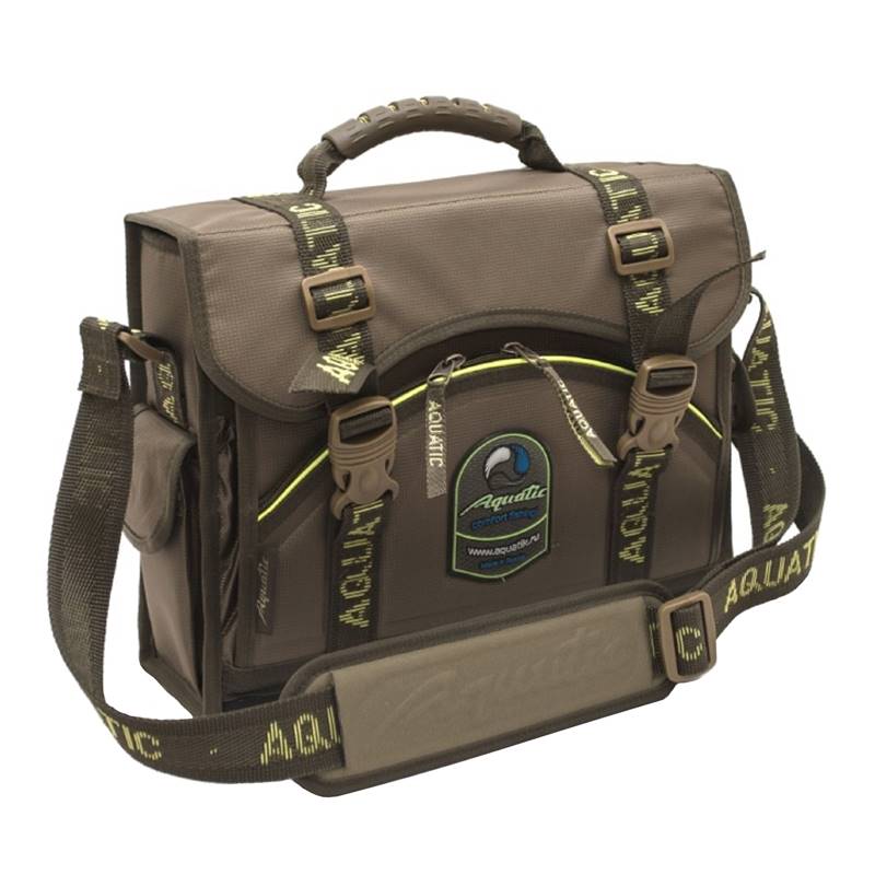 Полужесткая сумка Aquatic сделана из непромокаемых нейлоновых материалов. Сумка имеет 2 отделения с дополнительными перемещающимися перемычками и карманами на резинке. Сзади расположен карман на всю длину сумки. По бокам есть маленькие карманы с клапанами на липучке. На передней части расположена снимающаяся пенка для приманок. Современный дизайн позволит использовать ее также и в повседневной жизни. В сумку помещаются документы формата А4, также она удобна для переноски ноутбуков и прочего.
