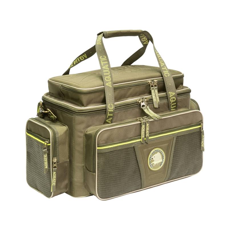 Большая сумка Aquatic С-33 для фидерной или карповой рыбалки. В сумку вставлена дополнительная сумка-термос (поставляется в комплекте с сумкой). Верхний клапан совмещён с карманом для тэклбоксов и изнутри оснащен дополнительными карманами на молнии для различных аксессуаров. Три съёмные перегородки позволяют реализовать различные варианты организации внутреннего пространства.
