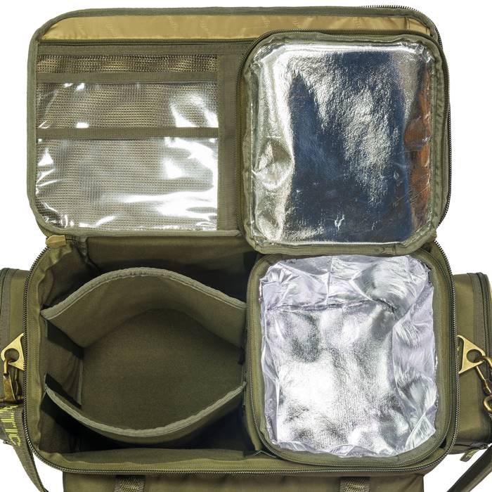 Сумка имеет 3 объемных накладных кармана, дублированных карманами из сетки для хранения тэклбоксов, поводочниц, сигнализаторов поклёвки или дополнительных снастей и инструмента.