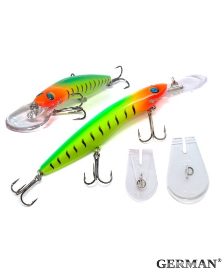 Воблер German Aggressor V3 125F - C007 - характеризуется особой игрой: корпус приманки колеблется из стороны в сторону во время проводки. Воблеры издают легкий шум и оснащены лопастью, которая гарантирует исключительную прочность при возможных соприкосновениях с подводными препятствиями. Хотя в основном рыболовы используют воблер German Aggressor при ловле троллингом, она идеально подходит также для кастинга. При ловле на водоеме с рельефным дном хвостовая часть приманки позволяет ей избежать зацепов, если вовремя ослабить леску. Если вам необходимо достичь самой скоростной проводки при троллинге, снимите крючок, который находится в центральной части приманки. Важным достоинством воблеров German Aggressor является сменная носовая лопасть, фиксируемая в корпусе специальным замком. Каждый воблер комплектуется двумя сменными лопастями – для стандартной и углубленной проводки. Покупая воблер German Aggressor, вы становитесь обладателем сразу двух разных приманок.