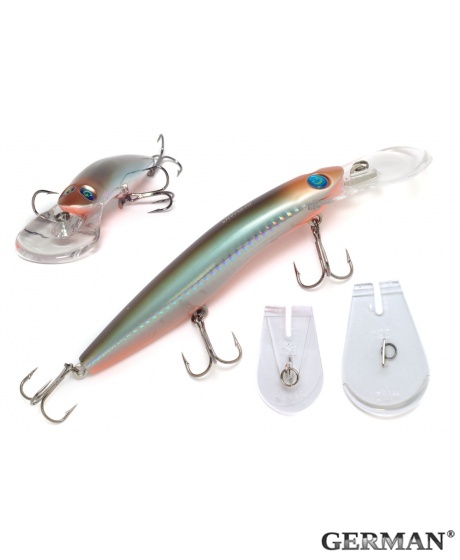 Воблер German Aggressor V3 125F - C021 - характеризуется особой игрой: корпус приманки колеблется из стороны в сторону во время проводки. Воблеры издают легкий шум и оснащены лопастью, которая гарантирует исключительную прочность при возможных соприкосновениях с подводными препятствиями. Хотя в основном рыболовы используют воблер German Aggressor при ловле троллингом, она идеально подходит также для кастинга. При ловле на водоеме с рельефным дном хвостовая часть приманки позволяет ей избежать зацепов, если вовремя ослабить леску. Если вам необходимо достичь самой скоростной проводки при троллинге, снимите крючок, который находится в центральной части приманки. Важным достоинством воблеров German Aggressor является сменная носовая лопасть, фиксируемая в корпусе специальным замком. Каждый воблер комплектуется двумя сменными лопастями – для стандартной и углубленной проводки. Покупая воблер German Aggressor, вы становитесь обладателем сразу двух разных приманок.