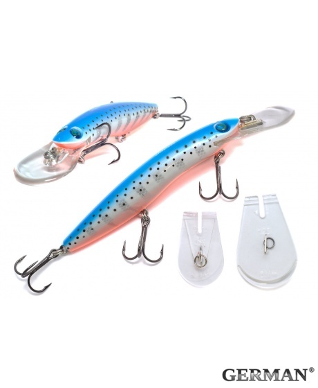 Воблер German Aggressor V3 125F - C110 - характеризуется особой игрой: корпус приманки колеблется из стороны в сторону во время проводки. Воблеры издают легкий шум и оснащены лопастью, которая гарантирует исключительную прочность при возможных соприкосновениях с подводными препятствиями. Хотя в основном рыболовы используют воблер German Aggressor при ловле троллингом, она идеально подходит также для кастинга. При ловле на водоеме с рельефным дном хвостовая часть приманки позволяет ей избежать зацепов, если вовремя ослабить леску. Если вам необходимо достичь самой скоростной проводки при троллинге, снимите крючок, который находится в центральной части приманки. Важным достоинством воблеров German Aggressor является сменная носовая лопасть, фиксируемая в корпусе специальным замком. Каждый воблер комплектуется двумя сменными лопастями – для стандартной и углубленной проводки. Покупая воблер German Aggressor, вы становитесь обладателем сразу двух разных приманок.