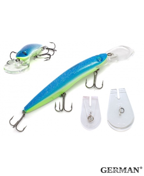 Воблер German Aggressor V3 125F - C203 - характеризуется особой игрой: корпус приманки колеблется из стороны в сторону во время проводки. Воблеры издают легкий шум и оснащены лопастью, которая гарантирует исключительную прочность при возможных соприкосновениях с подводными препятствиями. Хотя в основном рыболовы используют воблер German Aggressor при ловле троллингом, она идеально подходит также для кастинга. При ловле на водоеме с рельефным дном хвостовая часть приманки позволяет ей избежать зацепов, если вовремя ослабить леску. Если вам необходимо достичь самой скоростной проводки при троллинге, снимите крючок, который находится в центральной части приманки. Важным достоинством воблеров German Aggressor является сменная носовая лопасть, фиксируемая в корпусе специальным замком. Каждый воблер комплектуется двумя сменными лопастями – для стандартной и углубленной проводки. Покупая воблер German Aggressor, вы становитесь обладателем сразу двух разных приманок.