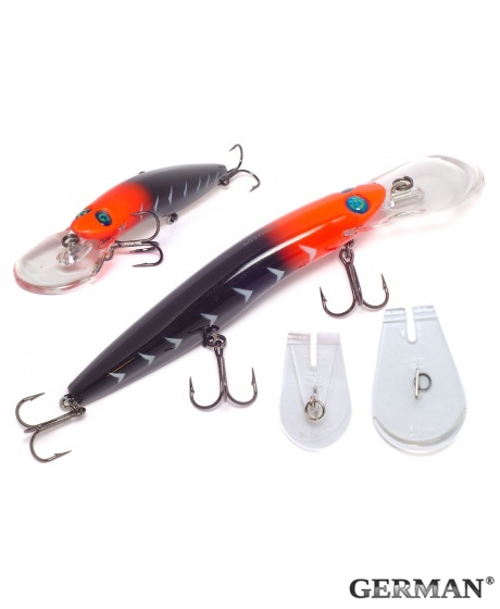 Воблер German Aggressor V3 125F - C230 - характеризуется особой игрой: корпус приманки колеблется из стороны в сторону во время проводки. Воблеры издают легкий шум и оснащены лопастью, которая гарантирует исключительную прочность при возможных соприкосновениях с подводными препятствиями. Хотя в основном рыболовы используют воблер German Aggressor при ловле троллингом, она идеально подходит также для кастинга. При ловле на водоеме с рельефным дном хвостовая часть приманки позволяет ей избежать зацепов, если вовремя ослабить леску. Если вам необходимо достичь самой скоростной проводки при троллинге, снимите крючок, который находится в центральной части приманки. Важным достоинством воблеров German Aggressor является сменная носовая лопасть, фиксируемая в корпусе специальным замком. Каждый воблер комплектуется двумя сменными лопастями – для стандартной и углубленной проводки. Покупая воблер German Aggressor, вы становитесь обладателем сразу двух разных приманок.