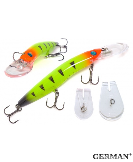 Воблер German Aggressor V3 125F - C236 - характеризуется особой игрой: корпус приманки колеблется из стороны в сторону во время проводки. Воблеры издают легкий шум и оснащены лопастью, которая гарантирует исключительную прочность при возможных соприкосновениях с подводными препятствиями. Хотя в основном рыболовы используют воблер German Aggressor при ловле троллингом, она идеально подходит также для кастинга. При ловле на водоеме с рельефным дном хвостовая часть приманки позволяет ей избежать зацепов, если вовремя ослабить леску. Если вам необходимо достичь самой скоростной проводки при троллинге, снимите крючок, который находится в центральной части приманки. Важным достоинством воблеров German Aggressor является сменная носовая лопасть, фиксируемая в корпусе специальным замком. Каждый воблер комплектуется двумя сменными лопастями – для стандартной и углубленной проводки. Покупая воблер German Aggressor, вы становитесь обладателем сразу двух разных приманок.
