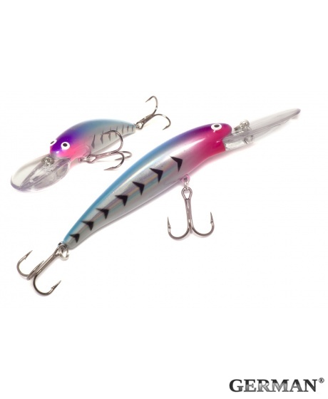 Воблер German GG Bomb 85F - C229 - данная модель выпускается в двух типоразмерах: 85 и 115 мм, а также с разным заглублением до 3,5-4 и до 6 метров соответственно. Этакая отмычка к хищнику, которого нужно найти обловив наиболее популярные горизонты предпочитаемых им. Две версии одной приманки, позволят вам сделать это беспрепятственно. Помимо судака, эта модель прекрасно ловит и других пресноводных хищников. Позволяет ловить как в заброс, так и троллингом. Округлые формы лопатки помогают избежать закапывания в дно и сводят к минимуму вероятность зацепов о донный рельеф.