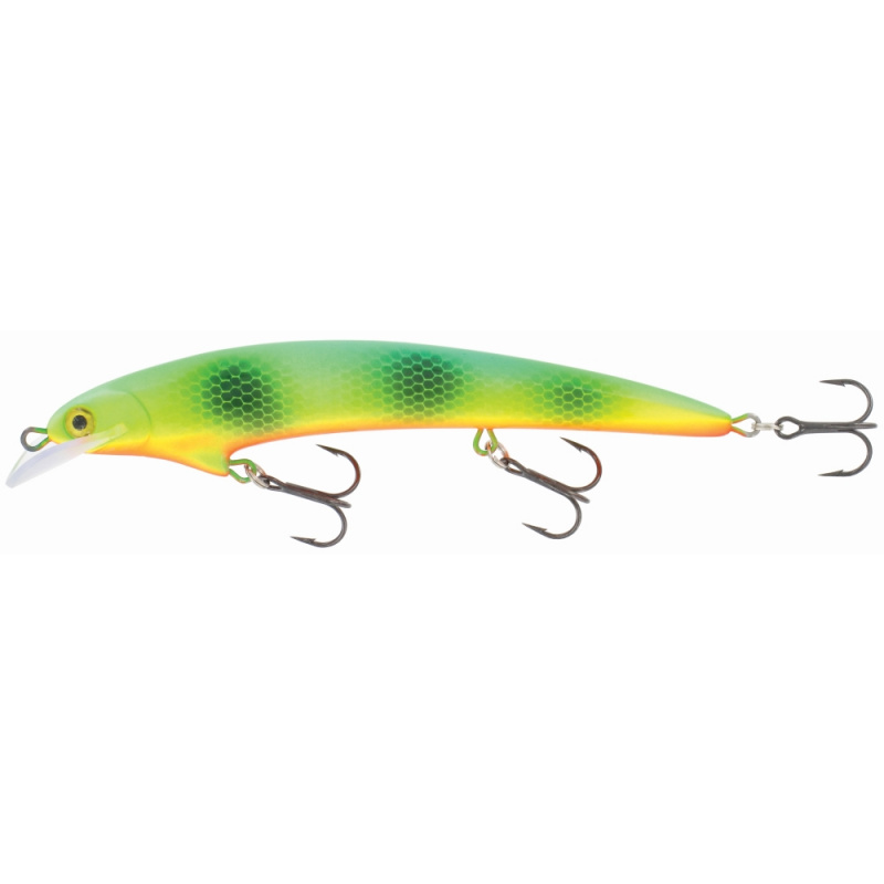 Воблер Kuusamo Santeri 130/15 BL/GR/Fye/FR UV - самая большая модель в семействе Santeri. Оснащена традиционной круглой вогнутой лопастью и тремя тройниками. Игра у Santeri 130мм более плавная и размашистая.