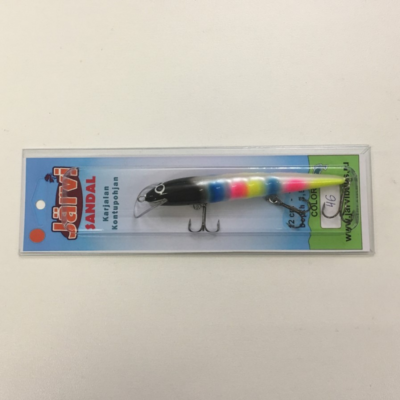 Воблер Ярви Сандал цвет 46 - троллинговый воблер, оснащен седловидной лопастью 25 мм, что придает воблеру двухпроекционную игру (двойная игра) и мелкочастотные колебания со срывами (уходами по сторонам). Характерная особенность этой модели - волнистые, как бы рефлёные, бока приманки, что делает её игру "трепещущей" и размашистой.