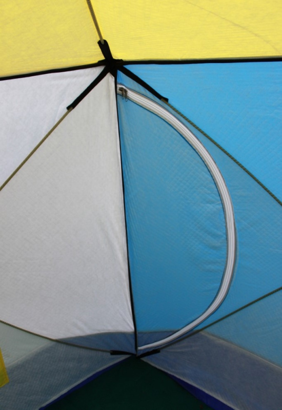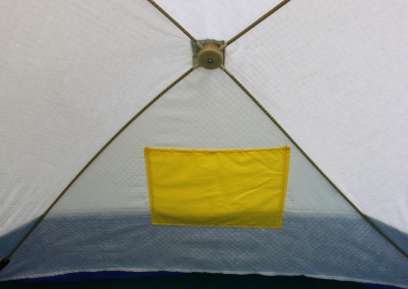 Внешний тент изготовлен из синтетической непродуваемой ткани оксфорд 300PU. Внутренний тент состоит из утепленного стеганого полотна (синтепон + подкладочная ткань таффета), его еще называют термостëжка.